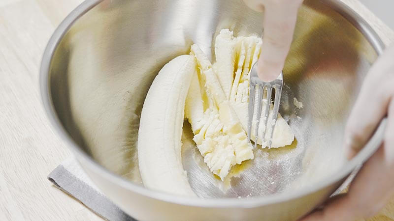 1、バナナをボールに入れ、フォークやマッシャーなどで潰しておきます。