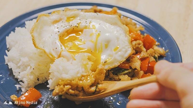 バジルの香りに、ナンプラーの風味、豚肉の旨味がガツンと来ます。適度な辛さもあって、ひと口食べると止まらなくなる、あとを引く美味しさです。